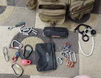 The climb bag's left front pocket contains hardware and rope pouches for the ground crew