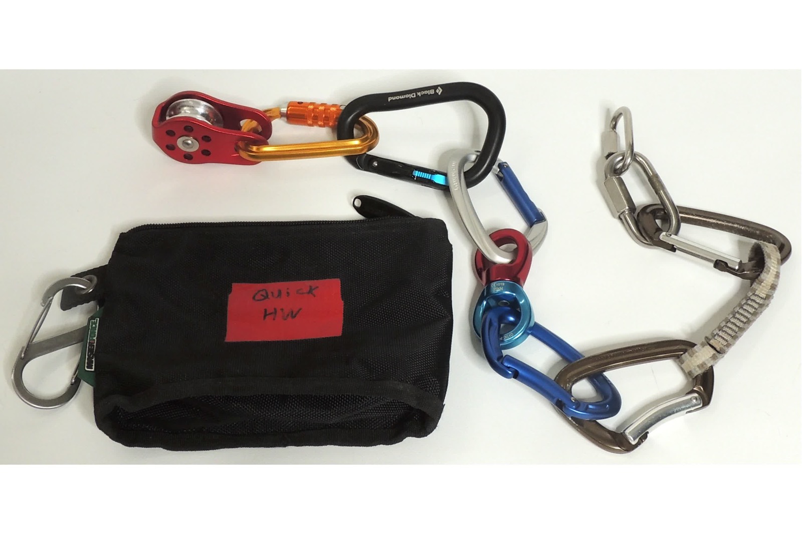 The "quick HW" pouch contains carabiners, a quick-draw, pulley, swivel, and closable links