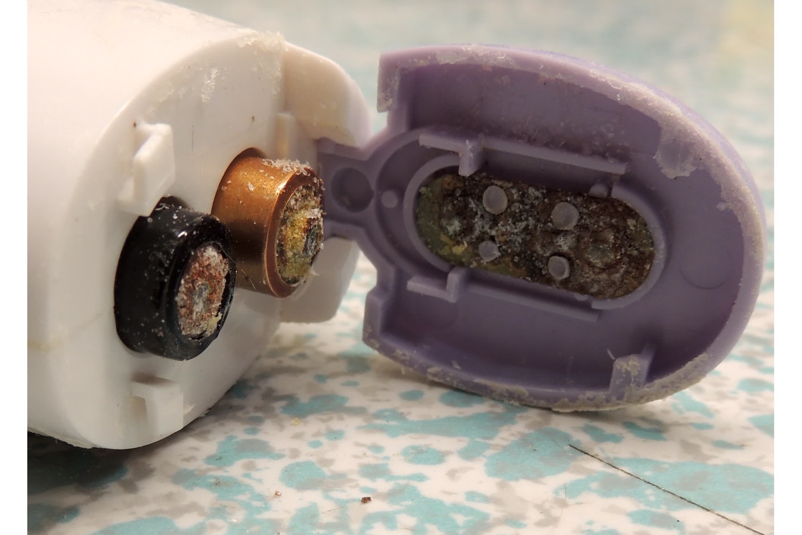 This one wins my prize for "nastiest corrosion on a battery hatch". The crust was brown and thick, looked