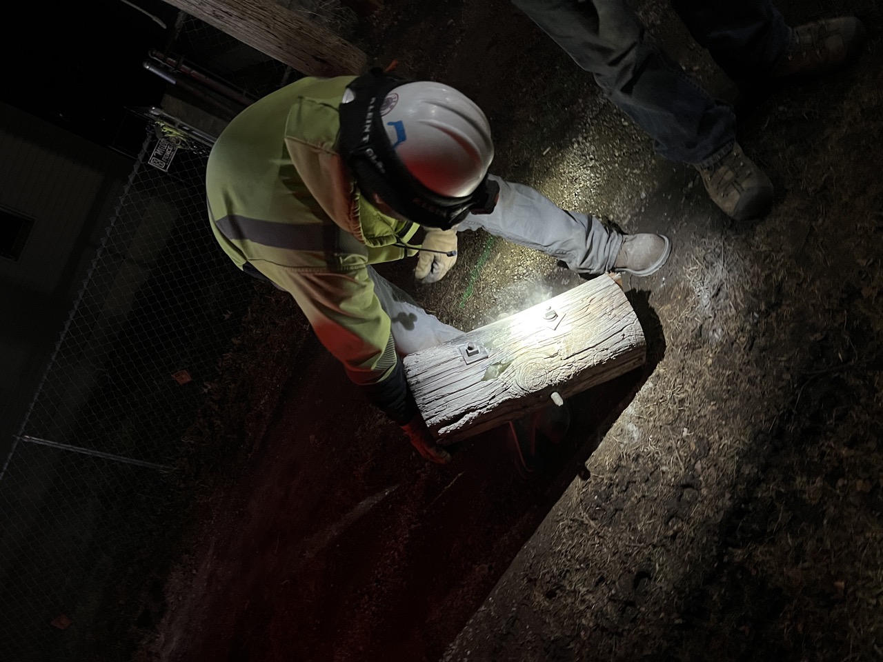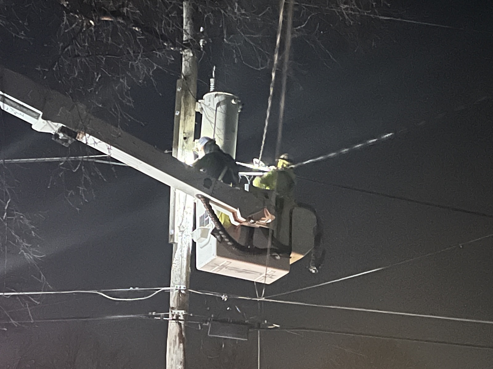 7:30, 9:30, and finally 12:30 (AM). The crew returned with a second truck and a fresh transformer and pole,