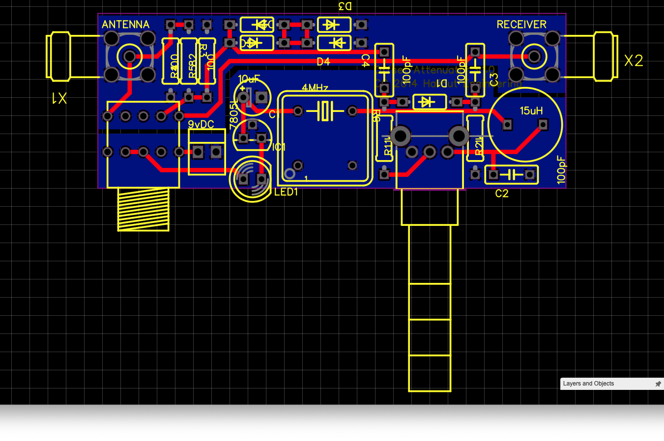 2 layer board of 2.58x0.97 inches (65.41x24.66 mm). A 4MHz offset attenuator for radio direction finding. Mostly based off this design with a few modifications: 3 position switch: Off, On (10db pad bypassed), and On with 10db pad. Better filtering LPF from 4MHz oscilator to mixer section, an LC instead of RC (replaced 100ohm resistor with 15uH inductor.) Should leak less RF. The board is designed to fit into a 1/2" conduit pass-through box, like what you might put on the handle end of a measuring tape yagi (Google it; there are MANY plans and designs for them.) Only parts that are ÒspecialÓ are: - 2P3T Rotary Switch - 15uH Inductor - 10k Pot - 4MHz Oscillator - 5vDC TO-97 Regulator The rest are just standard cheap-o resistors, capacitors and 1N4148 diodes, with values as labeled on the board. Easiest way to get a hold of me is probably on Twitter: @SmittyHalibut. Shoot me a note with your experiences if you use this board! Thanks!