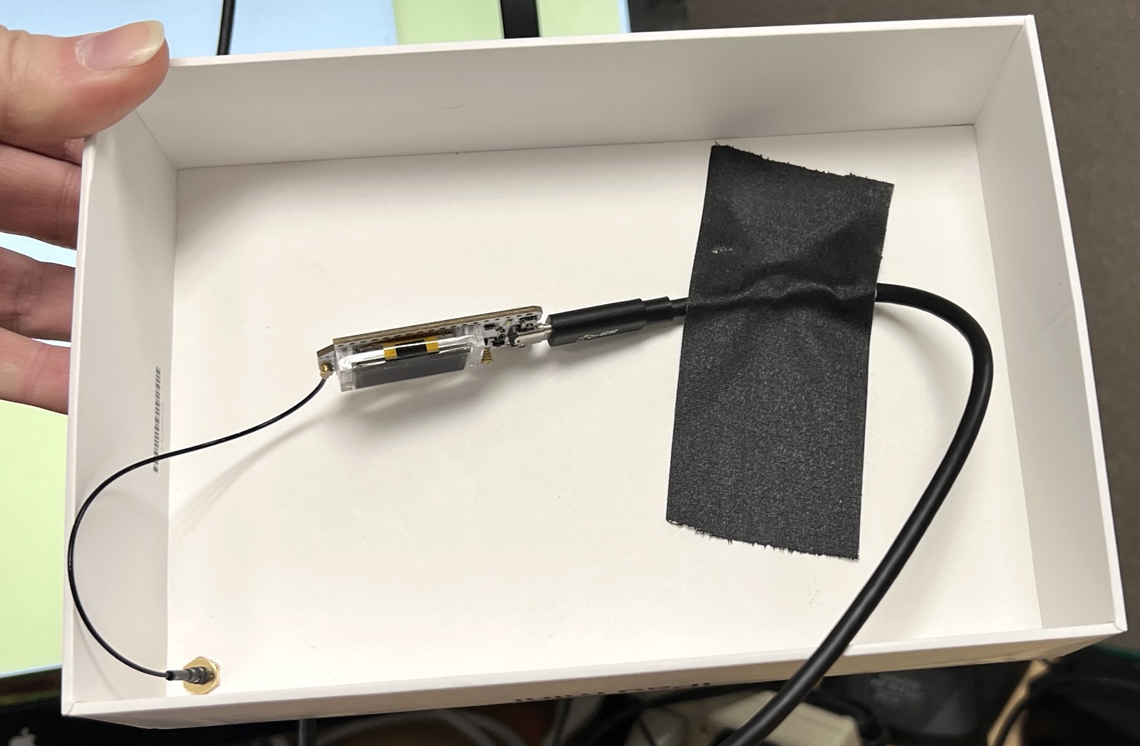 My first LoRa radio, a gift from a co-worker. It's now installed above my cubicle at work, inside a box with