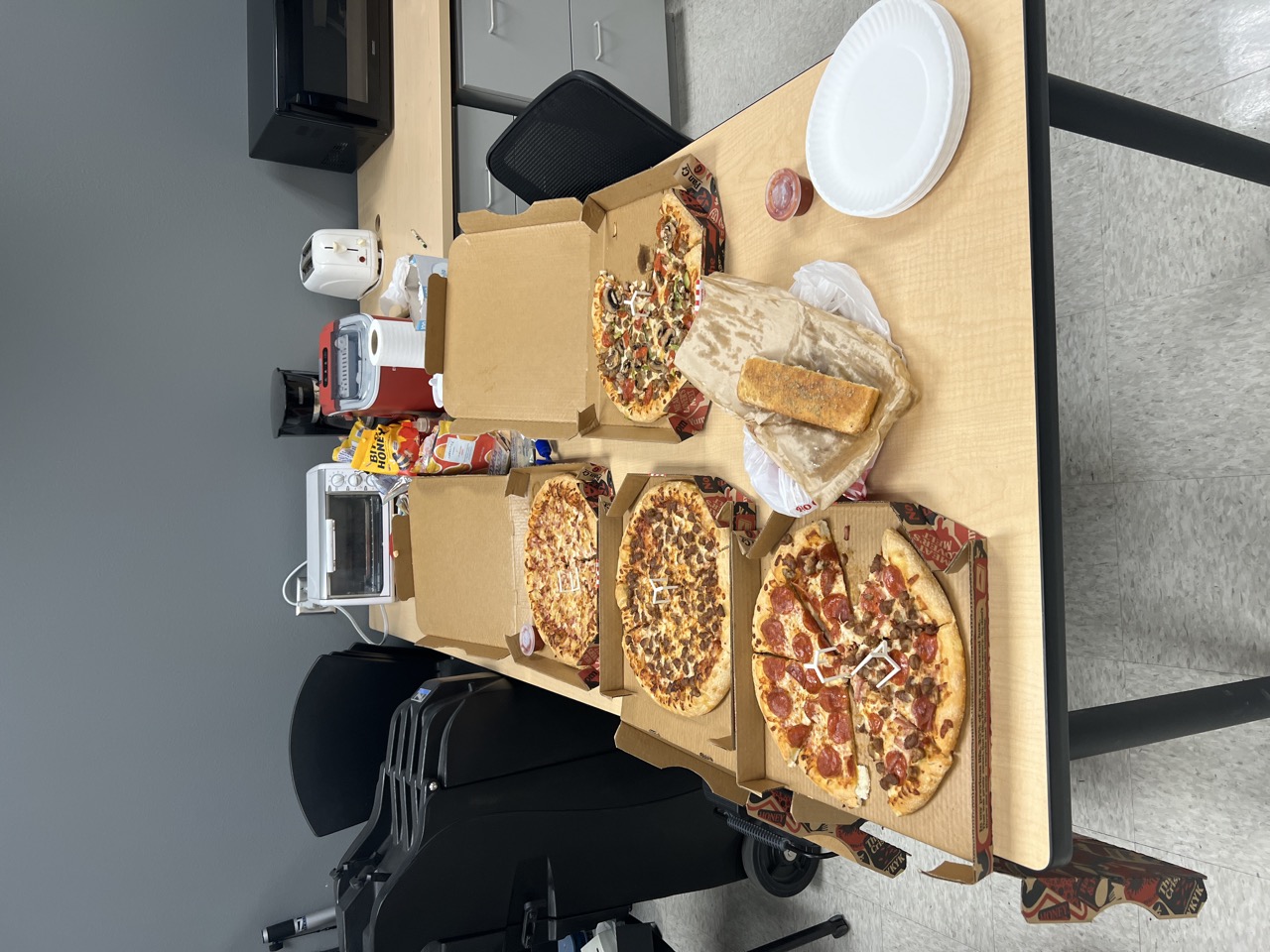 and Colleague. Today Laura provided us with five pizzas and some bread sticks for our efforts in restoring