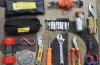 The pockets includes a pliers, diagonal cutters, box cutter, screwdriver, crescent wrench, and heavy scissors.