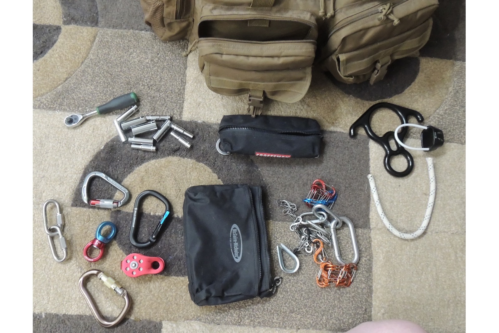 the climbing accessories in it along with some short bits of rope and a strap.