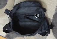 The main compartment holds mostly climbing gear, and I keep spare tethers in the front pouch.