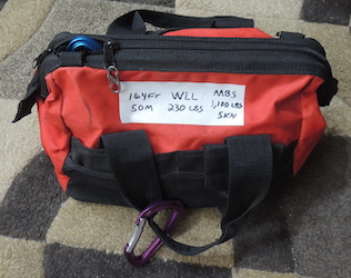 Inside the bag is 50 meters of light rope. (Sterling 6mm accessory cord) The near end has a pulley on it, and