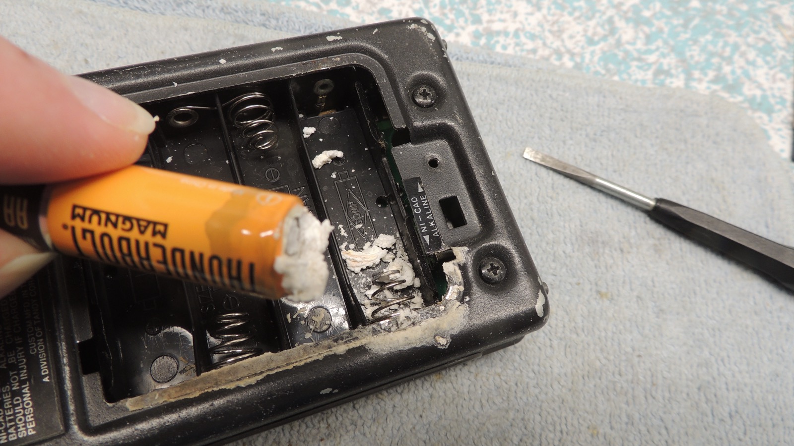 Discovered this leak when I went to use my little frequency counter. No idea where those batteries came from,