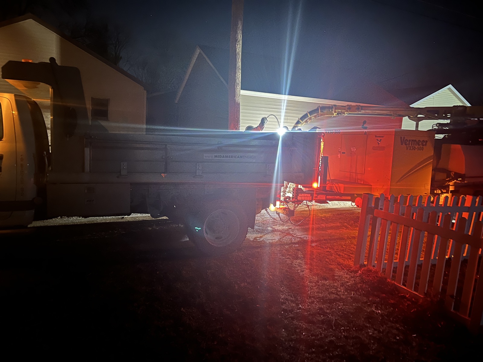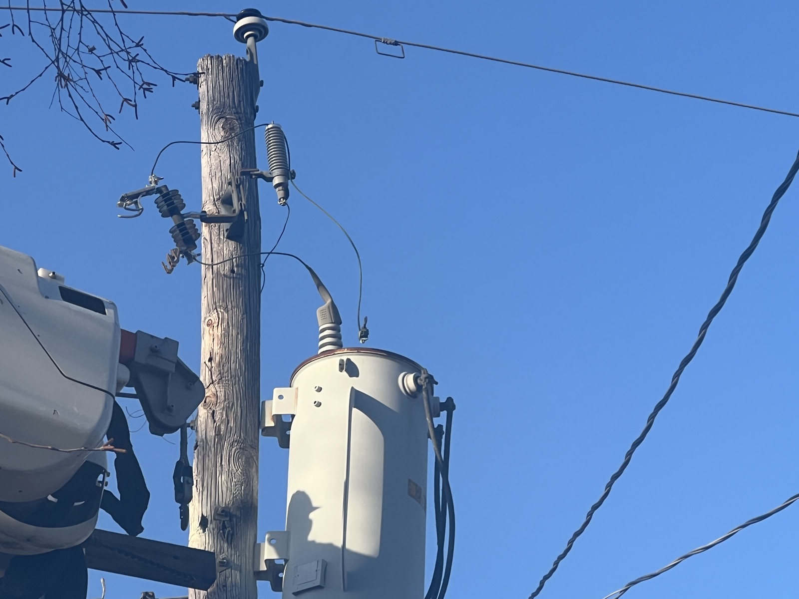 7:30, 9:30, and finally 12:30 (AM). The crew returned with a second truck and a fresh transformer and pole,