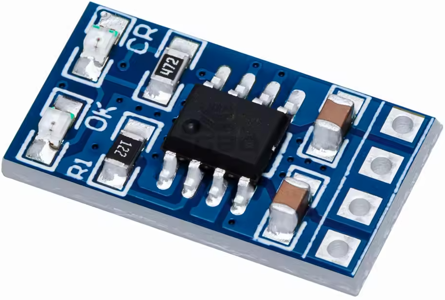 and no buck or boost regulator. Just a little IC, two LEDs, and a pair of resistors and capacitors.