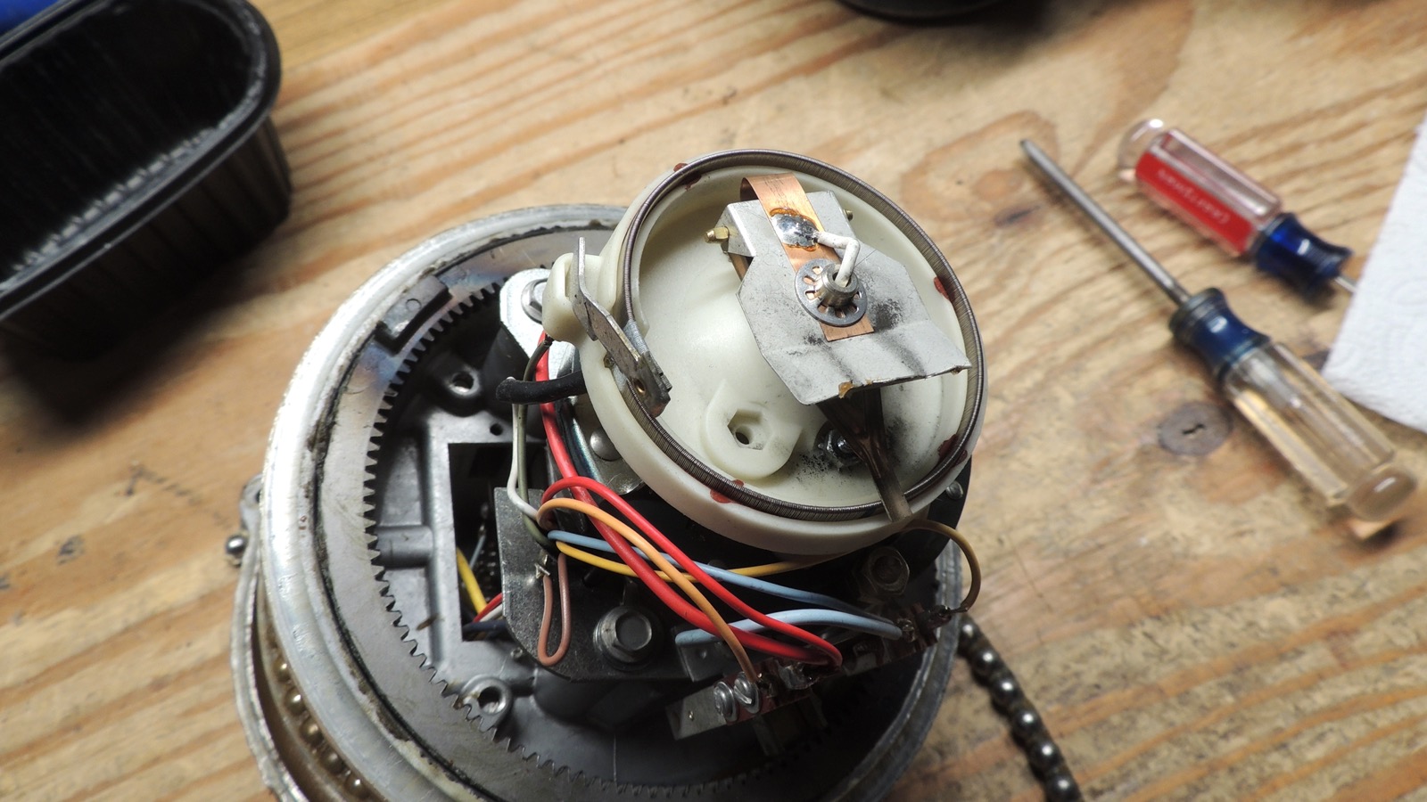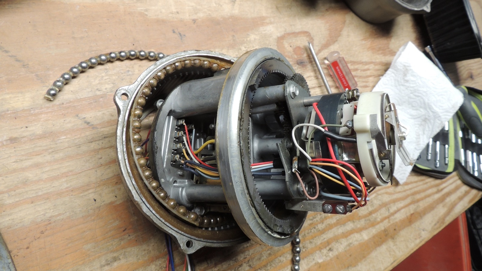 be a mix of thick brown grease on the mechanism and ring gear, and white lithium grease on the bearings. All