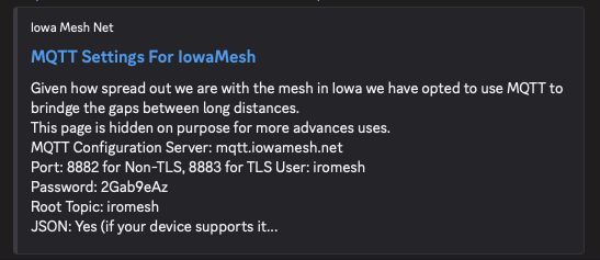 Broker: server: mqtt.iowamesh.net port: 8882 encryption: disabled user: iromesh password: 2Gab9eAz root topic: iromesh JSON: yes (if your device supports it, JSON is not supported on the nRF52 platform) Iowa Mesh channel: name: IROMesh key (128bit): 7V8jZEvMrVrEXx/c8UekOwE+tSlWaWNffKr6zBtQo/A=