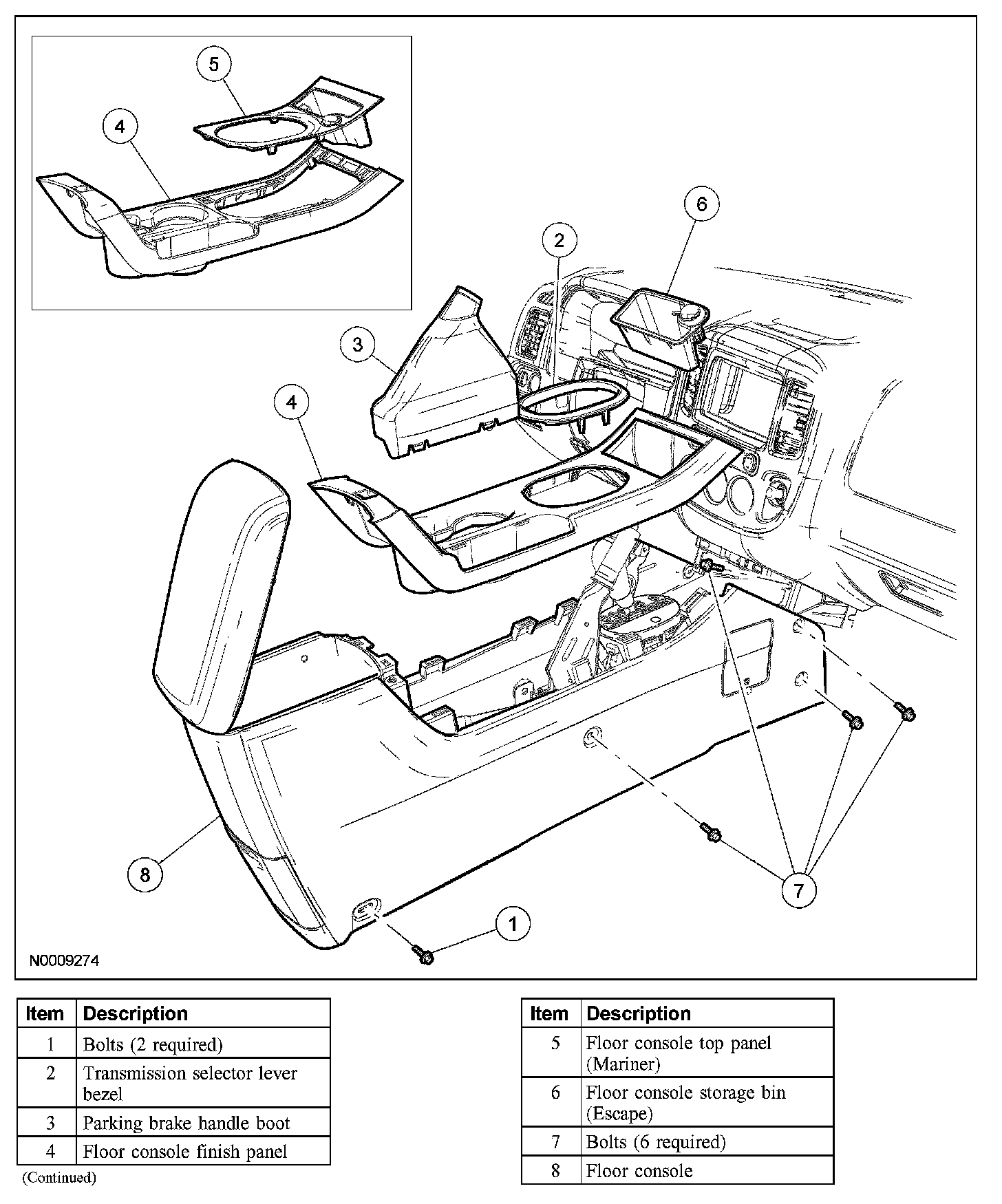 7. NOTE: On Escape, if removing the floor console storage bin, squeeze the front and rear of the storage bin to release the retaining tabs from the floor console finish panel.