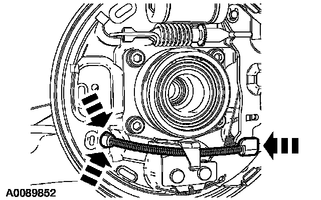 12. Compress the rear parking brake cable conduit locking tabs and pull the cable assembly through the brake backing plate.