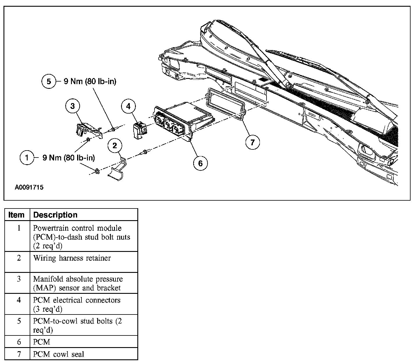 2. Remove the 2 powertrain control module (PCM) stud bolt nuts and position the wiring harness and the manifold absolute pressure sensor aside.