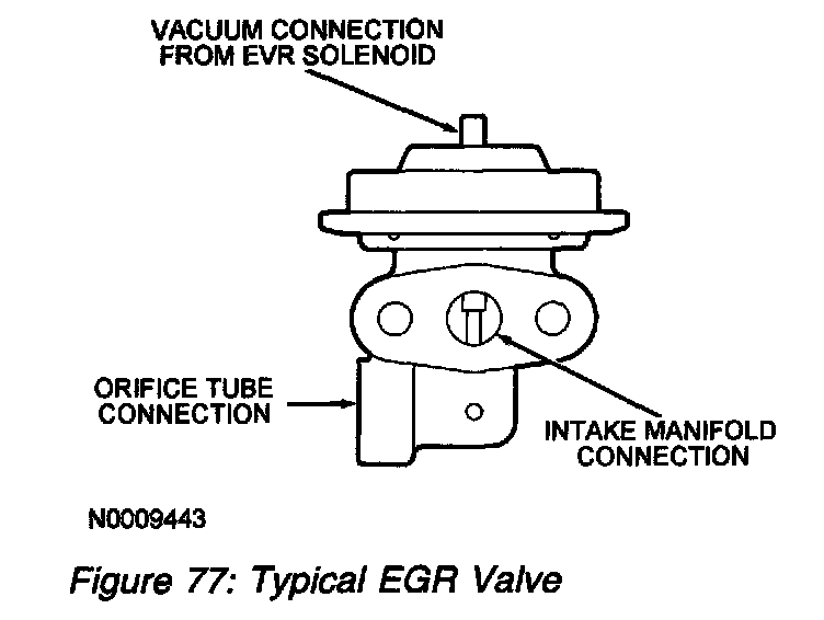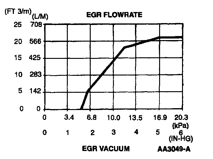 The EGR valve in the DPFE system is a conventional, vacuum-actuated. The valve increases or decreases the flow of exhaust gas recirculation. As vacuum applied to the EGR valve diaphragm overcomes the spring force, the valve begins to open. As the vacuum signal weakens, at 5.4 kPa (1.6 in-Hg) or less, the spring force closes the valve. The EGR valve is fully open at about 15 kPa (4.5 in-Hg).
