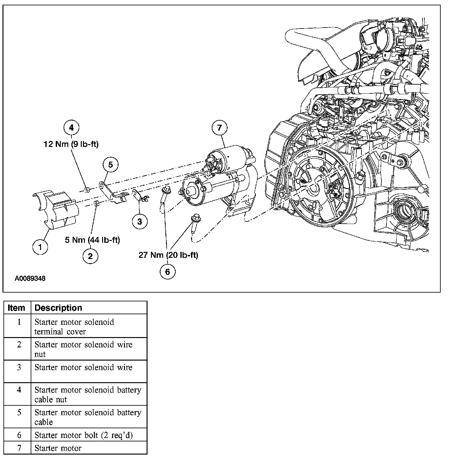5. Remove the starter motor solenoid battery cable nut and position aside the cable.